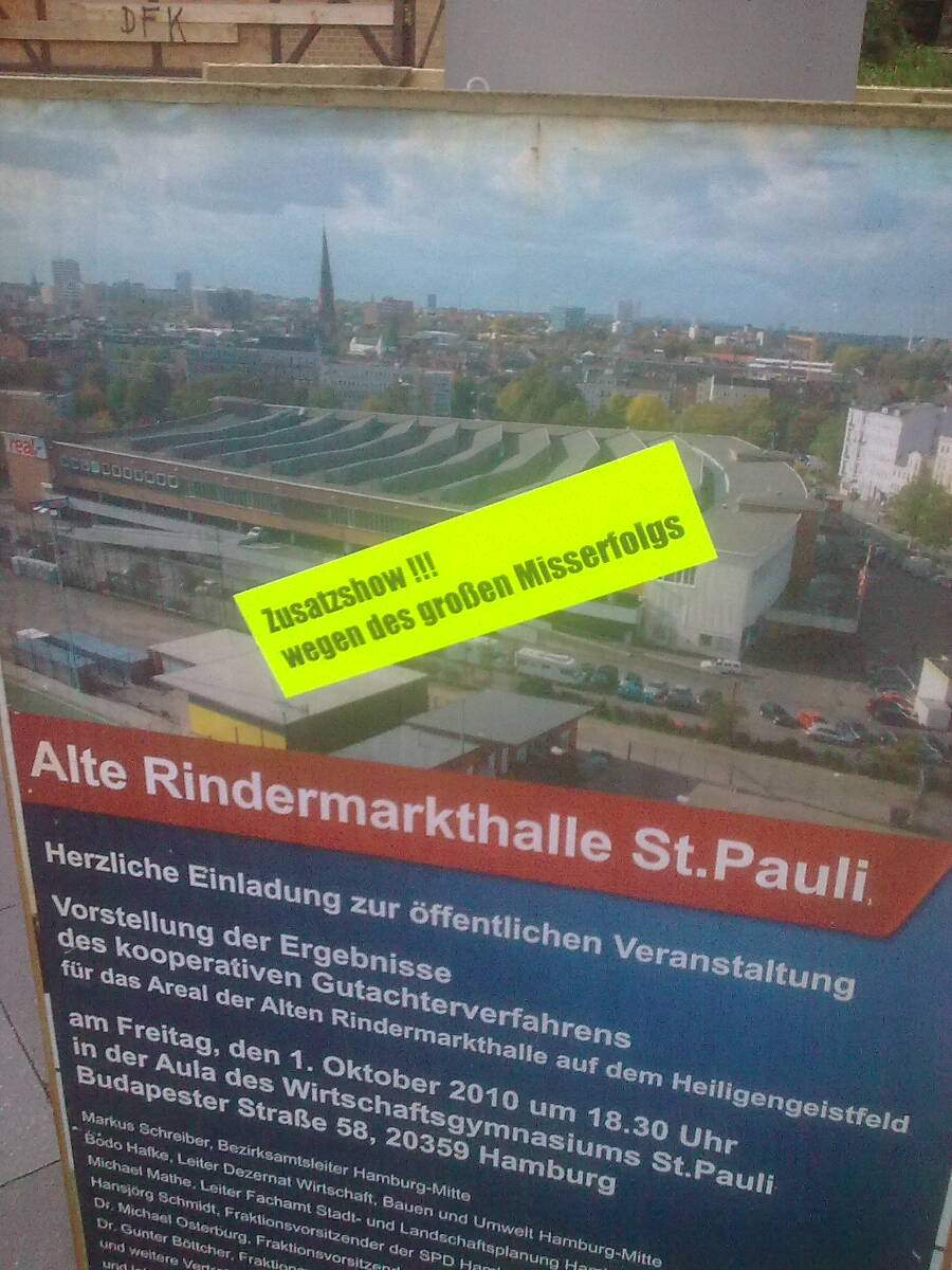 der hamburg architektur-blog berichtet über die esso-häuser am spielbudenplatz und stellt dar, dass sie ein gute chance für den senat wären, einfluss auf die mieten zu nehmen. °°°in bezug auf die kürzungen beim schauspielhaus rudert der nicht-kultursenator inzwischen öffentlich schon etwas zurück. da wünscht man gute armmuskulator, vielleicht schaft er es ja bis weit hinter die startlinie und erhöht die etats für kultur und soziales in der hansestadt, die mal aufhören sollte, wie ein schlechtes unternehmen jeden wert nur auf die billigste einahmen-ausgaben-rechnung zu reduzieren. das tun sie, obwohl die hamburger wirtschaft schon wieder wächst.°°°über die gründe für fette-mietenpartys lässt sich detailliert bei indymedia lesen°°°die bürgerbeteiligungsveranstaltung zur alten rindermarkthalle, ex-real, wird auf einen unbekannten zeitpunkt verschoben, da die organisatoren mit einem zustrom von 500 bürgerInnen rechneten und die aula der budapesterschule nicht so viel raum bietet. was soll das? wollen sie den bedarf für eine halle aufzeigen? haben sie angst vor den protestlern? ist es doch das was markus schreiber schon sagte „eine bürgerbeteiligung in dieser form wird es nicht mehr geben?“ kiezterror bloggte dazu folgendes bild:
