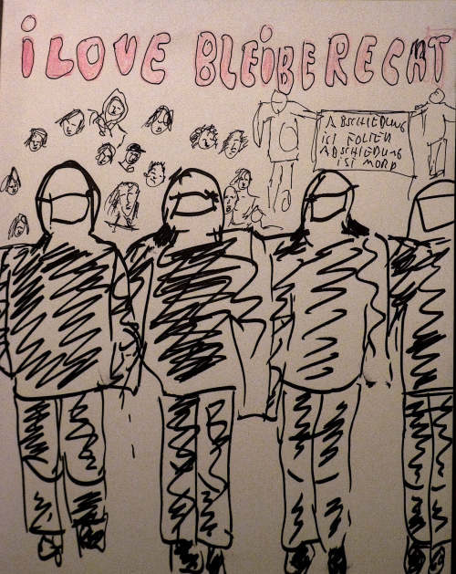 es gab luftballons, transparente und selbstgebasteltete schilder, auf den dingen standen wie „innenminister sind kaltherzige schweine“. und richtig: diese woche findet die innenministerkonferenz in hamburg statt und bespricht weitere verschärfungen des sicherheitsdispositivs. davon ließ sich gestern auch so einiges wahrnehmen: vor dem hauptbahnhof patroullierten polizisten mit maschinengewehren wegen des terroralarms. was das für eine einübung werden soll, war nicht ganz klar. gegen einen selbstmordattentäter oder eine kofferbombe erscheinen doch maschinenpistolen recht sinnlos. einen zweck haben sie allerdings erfüllt: es war ein mulmiges gefühl, zur demo zu gehen. der demonstrationszug wurde dann auch von schier unendlichen kolonnen schwarzgekleideter „sicherheitskräfte“ begleitet, die munter ihre helme schwangen und keinen kontakt zwischen einkaufender und demonstrierender bevölkerung ermöglichten. es ist quasi nicht mehr der öffentliche raum, in dem hier demonstrationen stattfinden, es ist der polizeiliche. jede demo in den letzten tagen wurde zum wandelnden gefahrengebiet. gestern war es erst recht ein schreiendes ungleichverhältnis zu den immer wieder so nett deklarierten menschenrechten, für die die demonstrantInnen ja eintraten. der satz „die würde des menschen ist unantastbar“ entlockte uns nur noch ein sehr müdes lächeln, denn täglich wird sowohl an den eu-außengrenzen als auch in der binnenzone von den staaten und kommunen bewiesen, wie antastbar diese würde ist und wie wenig es darum geht, für gerechtigkeit zu sorgen. man möchte gerne wissen, was der gestrige polizeieinsatz gekostet hat und ist sich sehr sicher, dass von dem geld tausend flüchtlinge ein jahr in wohnungen wohnen könnten. gesehen haben wir mindestens vierzig wannen, sechs wasserwerfer, zwei räumfahrzeuge und so weiter und so fort. da bleibt nur ein: puh.