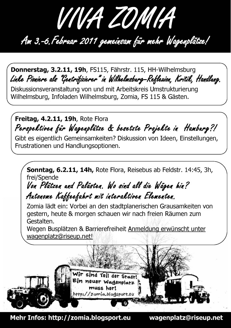 die ag mieten kritisiert das wohnungspolitsche wahlkampfgetöse der cdu in hamburg°°°die rote flora erklärt sich mit dem wohnprojekt in der liebigstraße 14 in berlin solidarisch und ruft zu einer sppontandemonstration am tag der räumung, der für den 2.02 angekündigt ist auf. °°° ein blog wartet mit kleinen stadtärgernissen auf°°°der protest der sozialromantiker st pauli gegen die weitere kommerzialsierung des viertels und des vereins hat es in die financial times geschafft.°°°