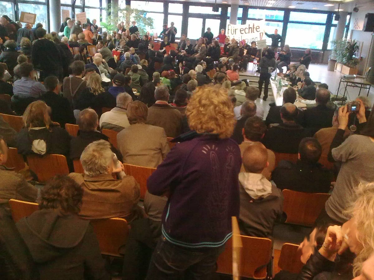 zunächst einmal: die aula war brechend voll, es standen sogar leute draussen im flur. geschätzt waren es auf jeden Fall über 200 menschen und die zahlen könnten bis 400 gehen. bei einer abstimmung stellte sich heraus, dass ca. zwei drittel der anwesenden dafür waren, stadtplanung in hamburg neu zu denken: kooperativ mit den anwohnerInnen, ergebnissoffen und auf jeden fall nicht von oben nach unten, egal wie nett die angebote zu den partizipationshäppchen auch klingen mögen.
