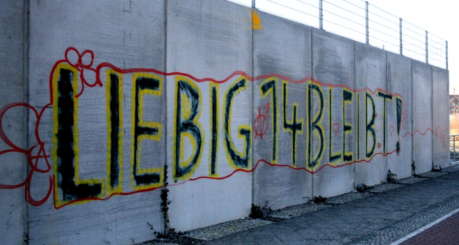die bevorstehende räumung des hausprojekts liebigstr in berlin löst recht viele solidaritätsaktionen und diskussionen aus. unter anderem gingen am wochenende 300 leute in berlin auf die straße, das rote rathaus wurde mit farbe beworfen, und in verschiedenen städten erscheinen solidarische schriftzüge auf den aussenfassaden. der innensenator lässt vermelden, dass die räumung unumgänglich sei.°°°der gentrificationblog untersucht das verhältnis von milchschaum zur städtischen aufwertung°°°