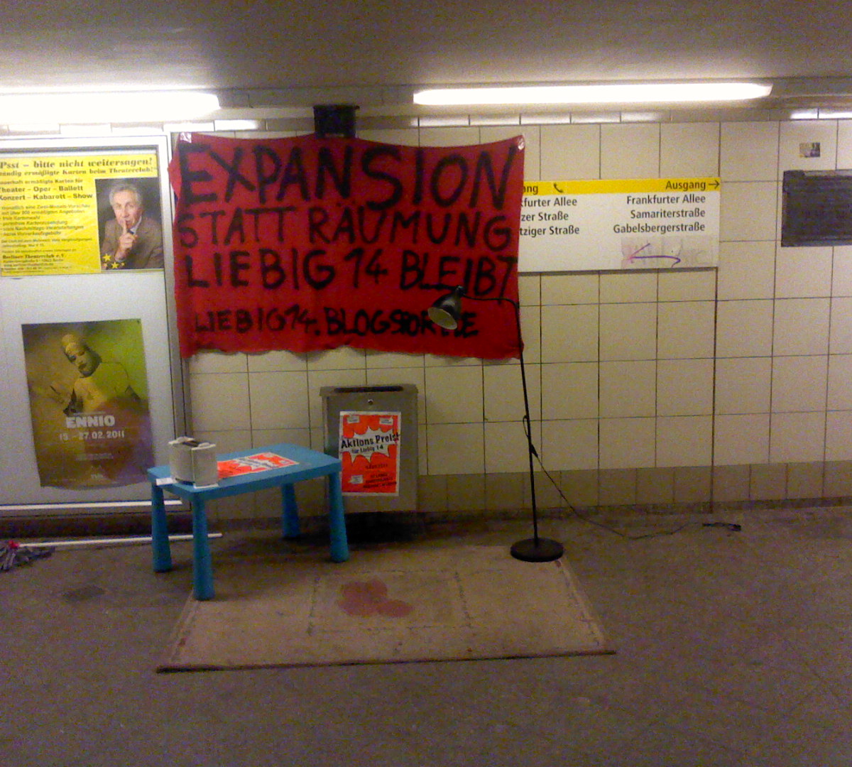 da am mittwoch die räumung der liebigstr bevorsteht, verdichtet sich der protest gegen die berliner wohnungspolitik. nicht nur direkt vor ort sondern auch in leipzig, wo ca. achtzig leute für die liebigstr. demonstrierten und in rom, wo es ein graffiti für das besetze haus gibt, und an einigen anderen orten, erklären sich menschen solidarisch mit den bewohnerInnen des hauses. in berlin kam es am samstag zu einer demonstration bei der ca. 3000 leute entschlossen deutlich machten, dass sie diese räumung nicht wiederspruchslos hinnehmen wollen. bei einer demonstration am freitag mit ca 750 teilnehmerInnen wurden fünf personen festgenommen. „wir bleiben alle“ rufen zu einem streik linker läden am 1.2 und 2.2 auf. spirit of squatters hat eine kleine zusammentellung von historischen hausbesetzungen in berlin in solidarität mit der liebig ins netz gestellt. gesetern kam es zu einer vorrübergehende hausbetzung in der bahnhofstr.°°° am leipziger platz wird jetzt das größte private bauvorhaben in berlin gestartet. auf rund 152.000 qm enstehen 170 wohnungen, ein einkaufzentrum, ein hotel und bestimmt auch ein paar büros°°°berliner künstlers ziehen nicht nach hamburg sondern nach marzahn°°°° gerüchte um korruption beim liegenschaftsfond werden recht laut°°°